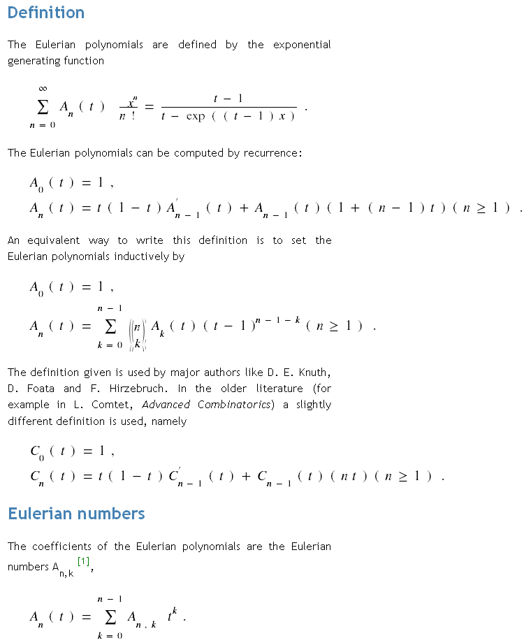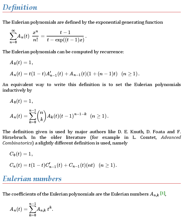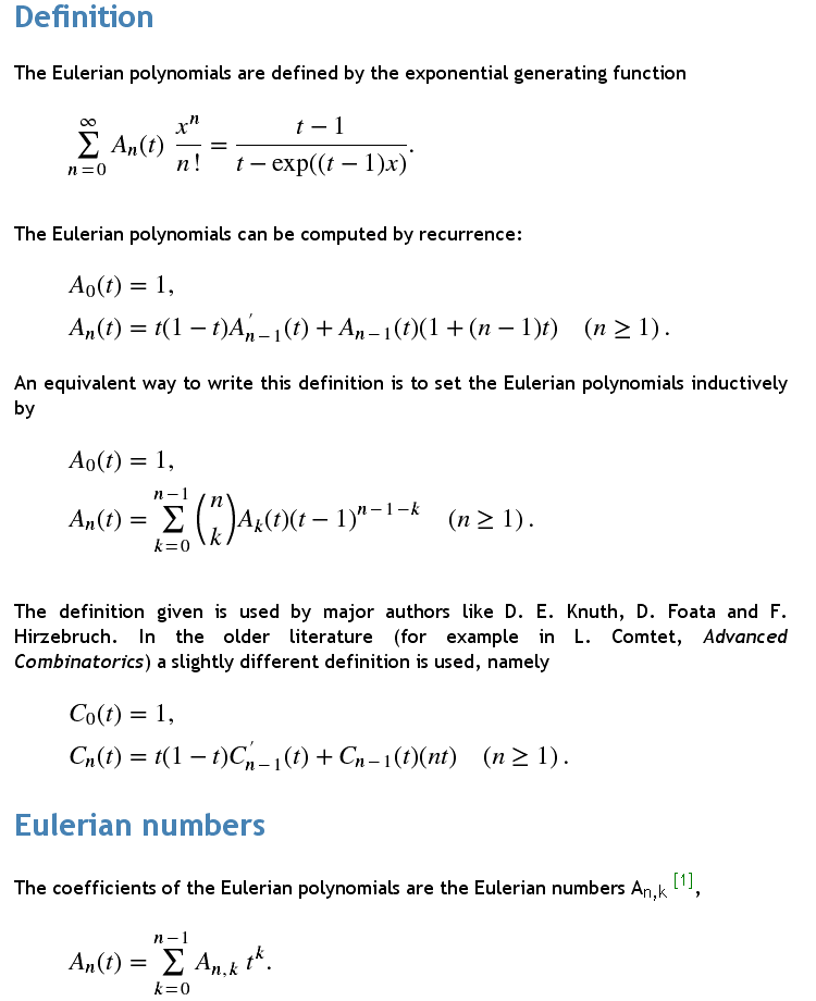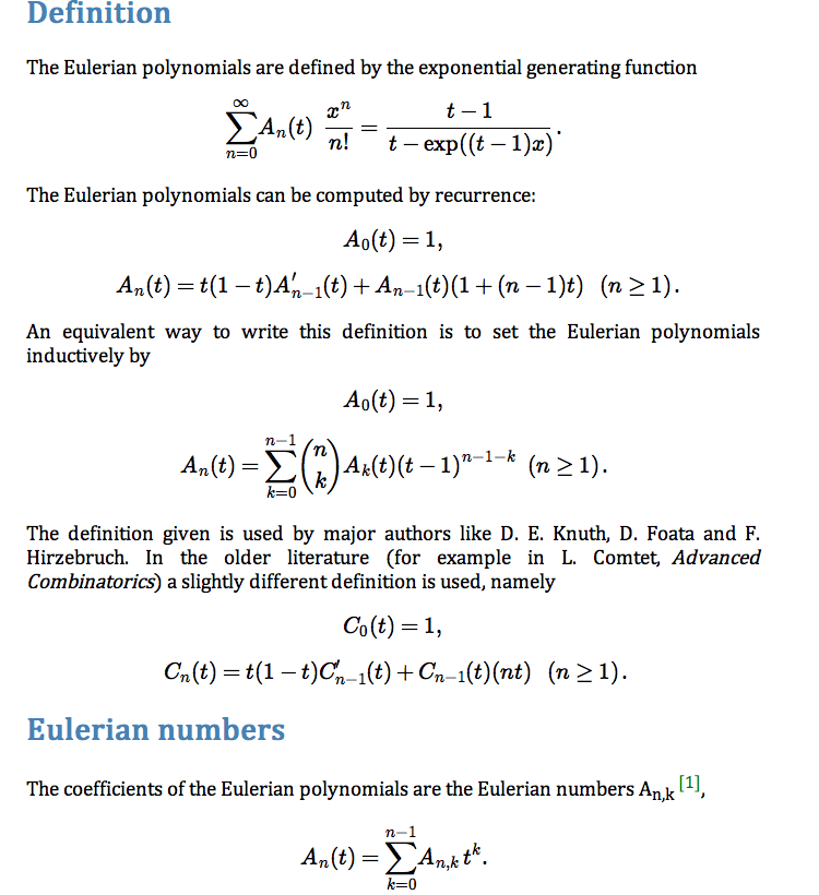 This page compares three web-versions of this article Eulerian polynomials (pdf). They all should look like more or less the same in your browser (see the links below). The difference is in their representation as web pages.